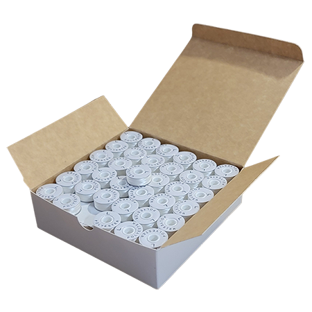 100% Filament Polyester • Cardboard Sides • 134 Yards per bobbin • 144 bobbins per gross • Color: White • These bobbins are engineered with a unique feature, which makes the tension of the thread smooth and consistent as it comes off the bobbin.